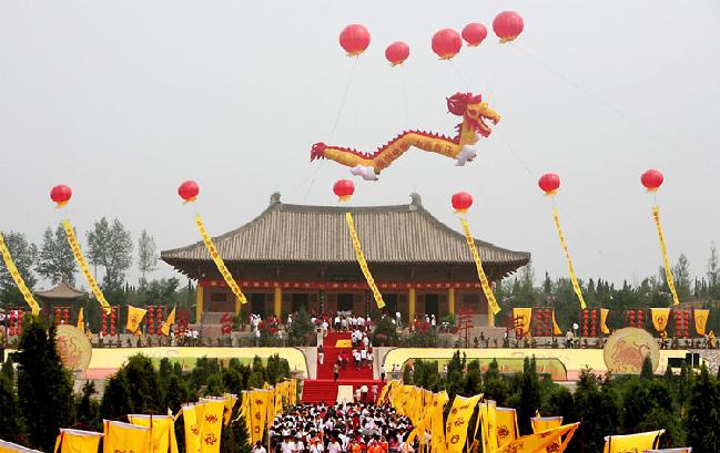 圖片說(shuō)明:由海外華人捐資興建的中華三祖堂,位于軒轅湖以東,黃帝泉北200處,是中國(guó)黃帝城文化旅游區(qū)的中心景點(diǎn)。三祖堂是一座仿唐建筑,重檐飛角,恢弘壯闊,全部木質(zhì)結(jié)構(gòu)。全堂占地104畝,由平面祭壇、三祖堂、后殿組成。殿內(nèi)三位祖先的塑像姿態(tài)各異栩栩如生,居中的黃帝氣宇軒昂,右側(cè)的炎帝睿智儒雅,左側(cè)的蚩尤勇武彪悍,塑像高6全部由泥土塑成。大殿四壁繪有涿鹿之戰(zhàn)、阪泉之戰(zhàn)、合符釜山、定都涿鹿四大歷史事件的大型壁畫(huà)。