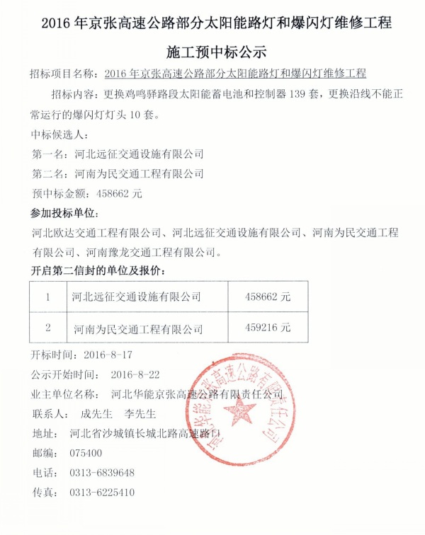 2016年京張高速部分太陽(yáng)能路燈和爆閃燈維修工程施工預(yù)中標(biāo)公示