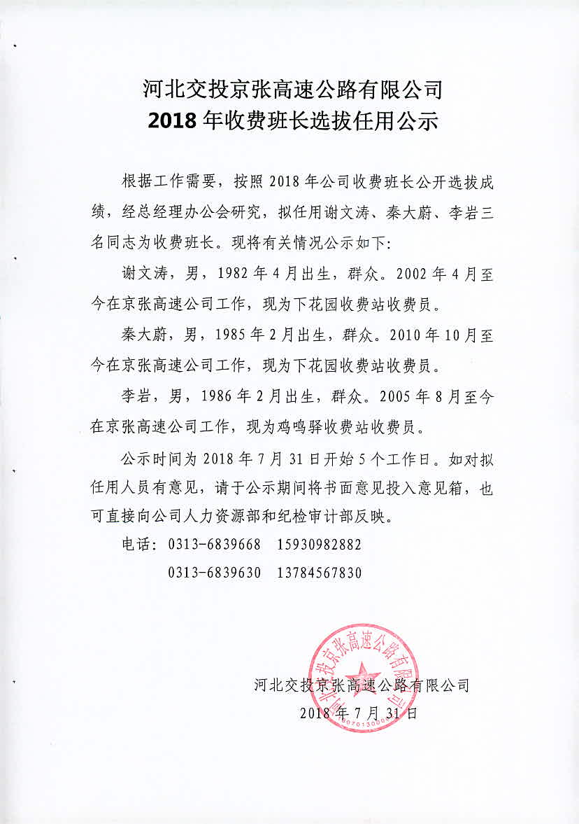 公司2018年收費(fèi)班長選拔任用公示