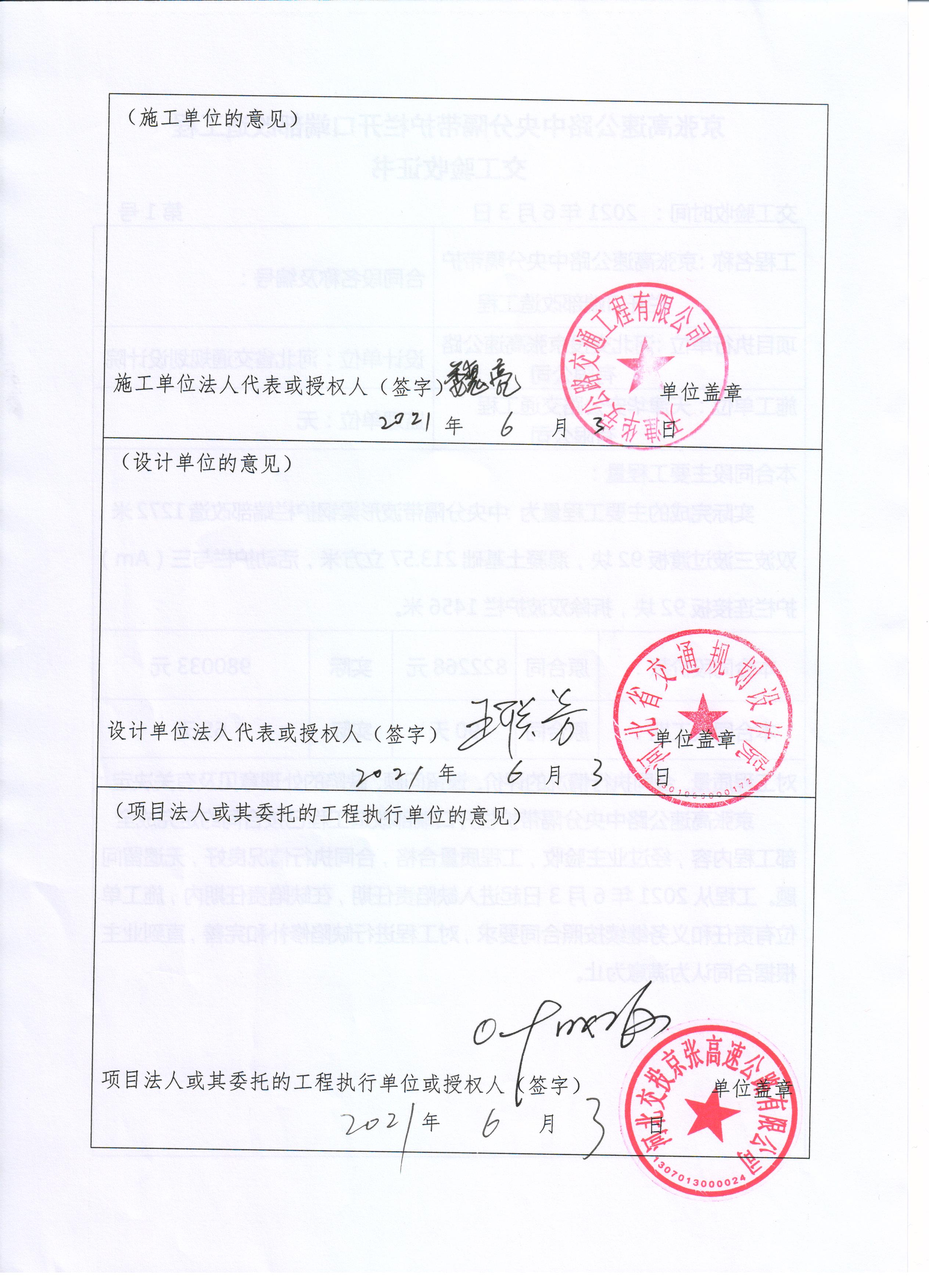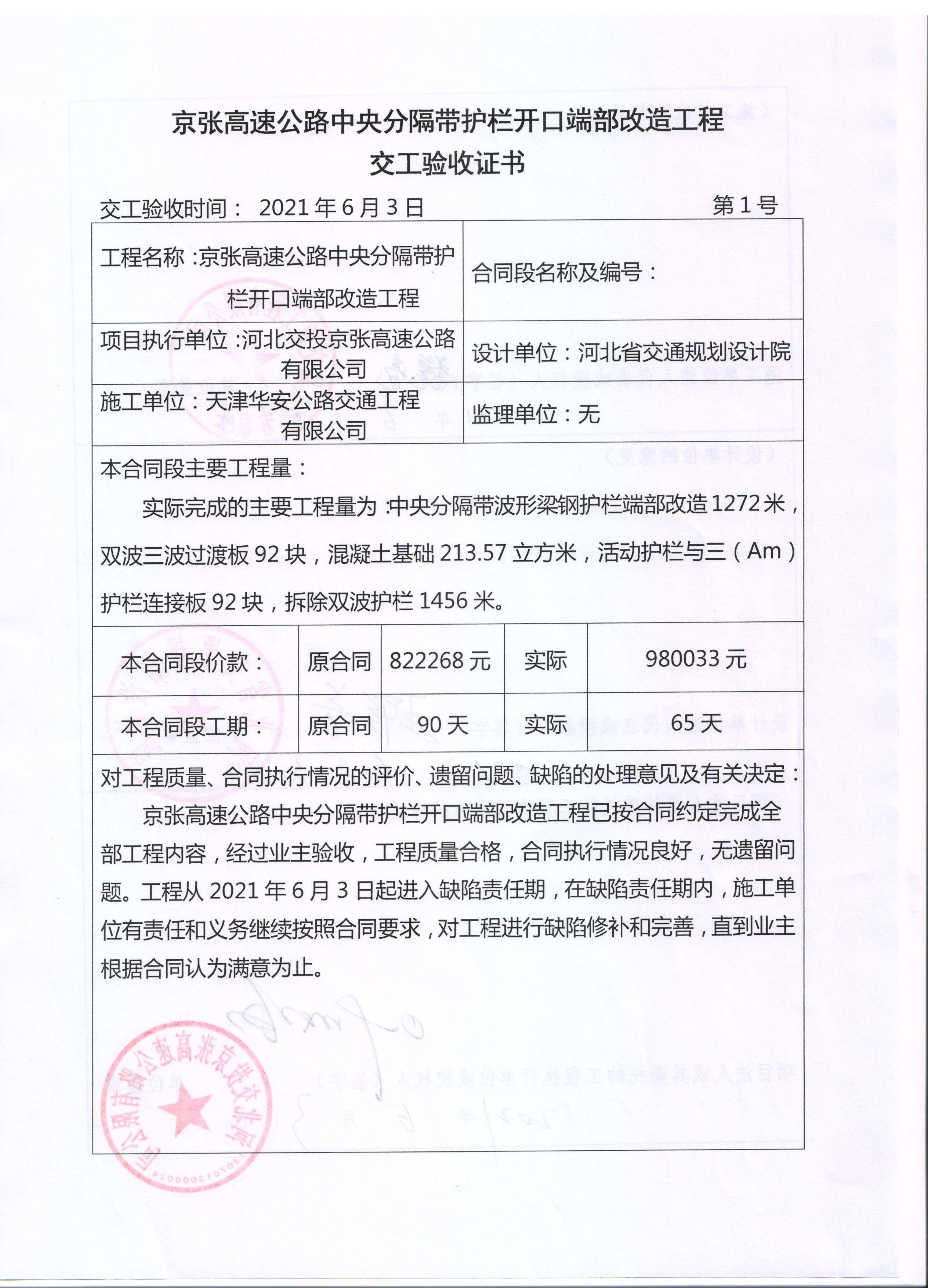 京張高速公路中央分隔帶護(hù)欄開口端部改造工程交工驗收證書