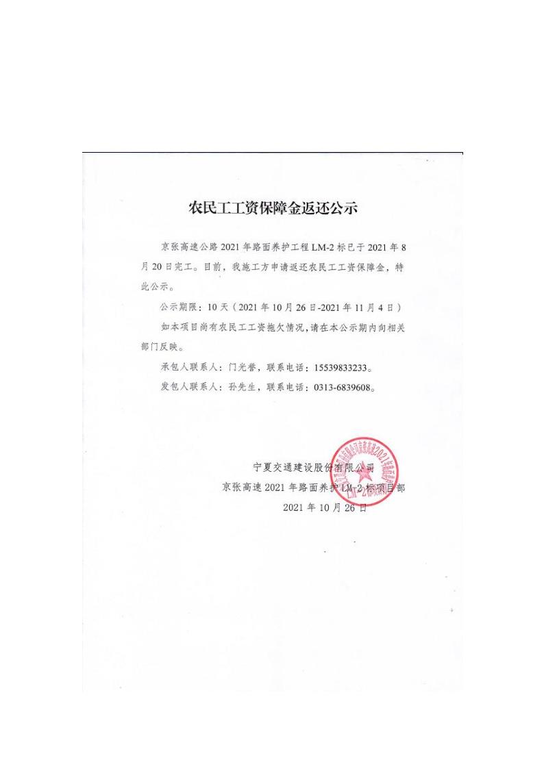 2021年路面養(yǎng)護(hù)工程農(nóng)民工工資保障金返還公示